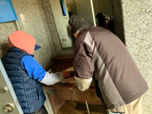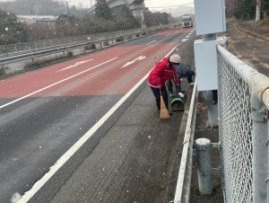 雪の降る氷点下の朝でしたが、トイレ掃除と国道2号線沿いの草取りをしました。