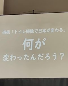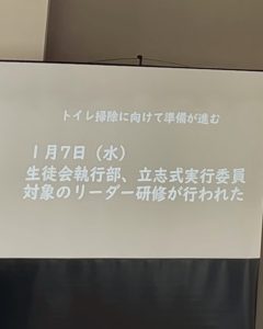 防府市立牟礼中学校立志式では、生徒さんによる実行委員会中心にトイレ掃除が行われ、更には保護者に向けて報告会もされました。
