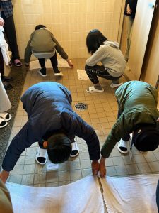 掃除道具の説明をして、掃除道具入れを見学して、掃除実習をします。